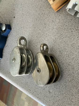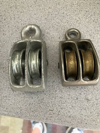 Two cast steel rope pulleys that will accommodate up to a 1/2" diameter rope.
