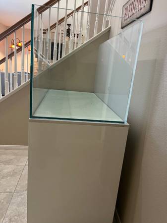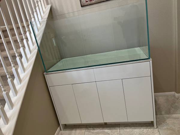 It is a good rimless glass tank never used with stand which is made of plywood and quartz on top. The drawers are self closing.