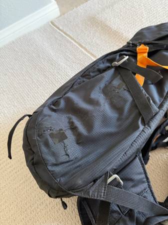 Great used condition, only flaw is a tear on the water bottle pocket, which has been patched (last photo).