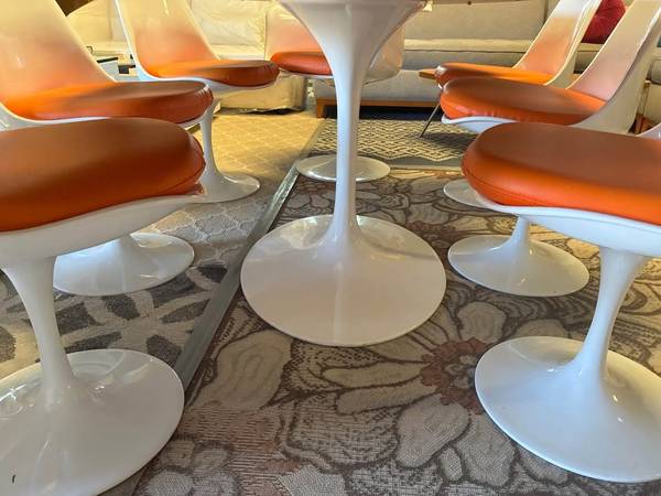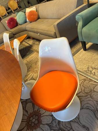 Sleek lines. Iconic design. This mid-century modern tulip table dining set is the epitome of timeless style. With its sculptural base and retro flair, it's a statement piece for any modern vintage home. +Available now DM for details or visit us in-store to see this beauty up close.