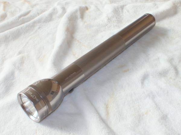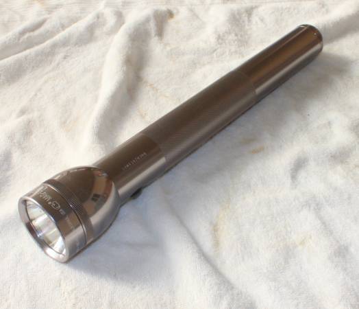 Requires 4 D-cell batteries. This is a clean flashlight, very bright, in perfect working condition, gently-used, without scratches, bumps, scars, etc. See pics. Very nice. Spare bulb included....