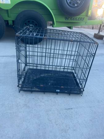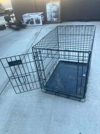Selling a medium-sized black metal dog kennel. Folds flat for easy storage and transport. Front door latch works well and the kennel is sturdy and clean.