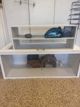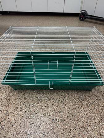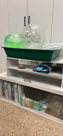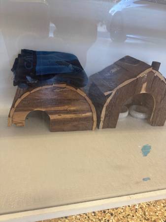 Pet crate for rodent, reptile or your favorite furry friend. Also included is an exercise wheel, wooden huts, extra crate and travel bag