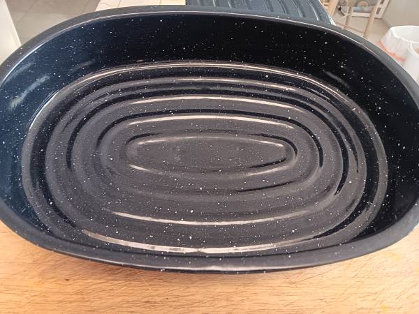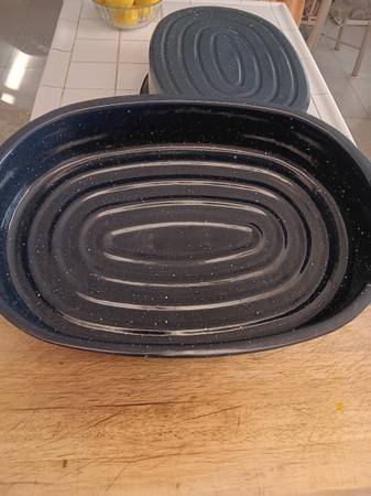 Vintage granite ware Naturally Non stick 18 inches long Can fit a turkey, or two chickens Cooks evenly and is non splatter, lid fits well Lid can go inside out for better storage