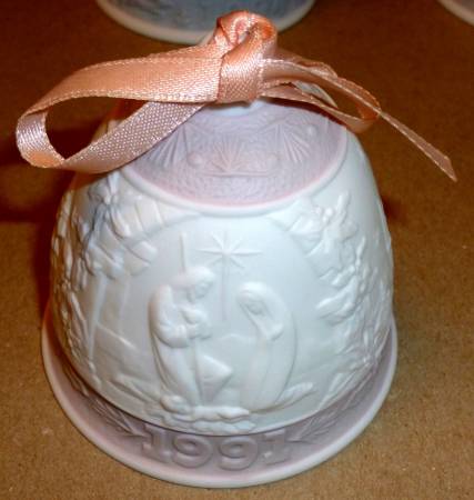 This is a complete collection of ten 1987-1996 handmade porcelain Lladro Christmas Bells which were issued for sale and retired only during their respective years, making them an instant annual collectible (I am the original owner of all ten). These beautiful bells were produced in a matte white finish and adorned with various holiday-themed cheerful images and year-specific tasteful pastel coloring along the top and bottom bell segments. All pieces are in mint dust-free like-new condition, including the individual clappers which have holiday-themed images embossed into them (snow flakes, Stars of Bethlehem, etc.) -- each teardrop-shaped porcelain clapper is functional and is supported by an attractive gold chain that is firmly anchored to each bell's interior. The official Lladro backstamp is present which guarantees authenticity, and all 10 are topped off with their original color-coordinated year-specific display ribbons threaded through each bell's canon. Dimensions per bell are 1.5" wide at the top flaring to 3" at the bottom, with a height of 3.25" and an approximate weight of 4-5 ounces.
