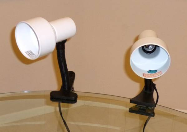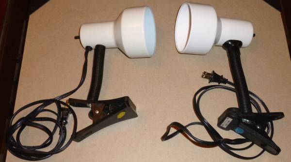These two portable clip-on gooseneck lamps come in quite handy when additional illumination is needed for either temporary or long-term needs. The clamping force for each lamp is excellent with built-in rubber grips to prevent surface marring and ensure that the lamp remains firmly in place after adjustment. One lamp has a pure white finish with a 5' cord, while the other has an off-white/near-white appearance and is equipped with a slightly longer 6' cord. Since both were originally designed for incandescent bulbs up to 60 watts max, these fixtures will now safely accommodate up to a "100-watt equivalent LED" bulb for brighter luminosity, greater efficiency, and substantial heat reduction. Both lamps are UL-Listed and their simple on/off rotary switches work solidly. All photos were taken by me in my smoke-free home and honestly represent the very nice condition of these two portable gooseneck clip-on lamps.