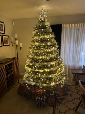 Balsam Hill is the gold standard for artificial Christmas trees. This super realistic tree looks like the real thing, but eliminated the headaches of watering and the mess of cleaning up and disposing of a real tree. It is pre-lit with warm white led lights that give that beautiful glow of traditional incandescent bulbs. It is in perfect condition and ready to make your holiday decor a spectacular sight. New from Balsam Hill, this tree costs $1200 before tax.