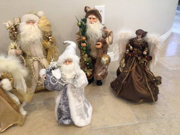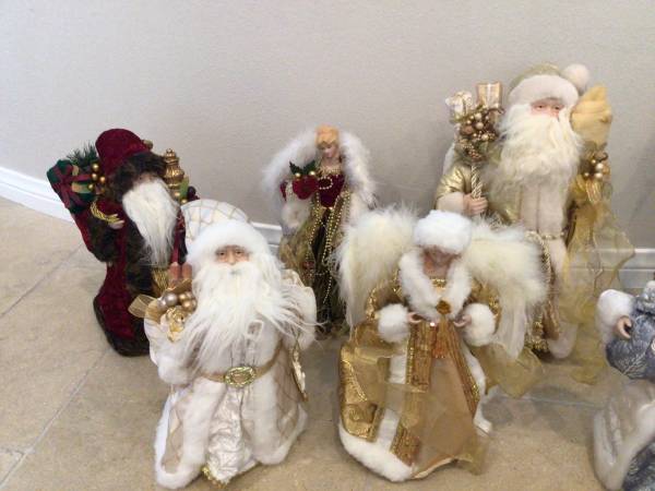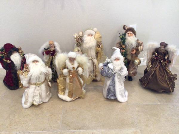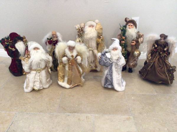 Set of (5) Christmas Santas and (3) Christmas Angels. These Collectable Items are in Like New Condition with No Damage or Discoloration of any kind! Father Christmas, Santa Claus, Mrs. Claus, Tree Toppers, Home Decor or Decorations. Measurements vary from 12” Tall to 17” Tall. Asking $150.