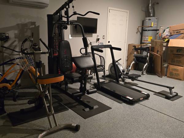 13. Gym Equiment (Rowing machine, Stationary bike, Weight set, free weights, Treadmill $3000
