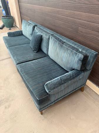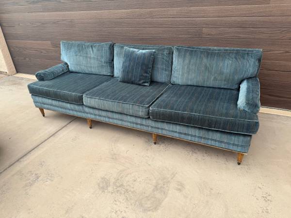 This listing is for a large vintage Retro Mid Century Couch. It measures 92” length x 36” width x 28” height. Material is Blue Corduroy with accent stripes of various colors. It is a very strong and sturdy piece . It is in excellent condition for its age. Cushions very firm ! Has one pillow and 2 armrests covers. Great Vintage look! Has some very small stains and some light pilling here and there. There is one tiny 2mm rip on the side corner. See pics with small flaws. Couch is in excellent condition as it had had a cover on it for most of its life with me . If you have any questions or would like to see / possibly purchase this couch, please message Eric through this listing or text/call at the contact phone number provided. Thank you