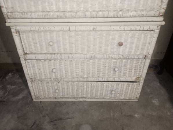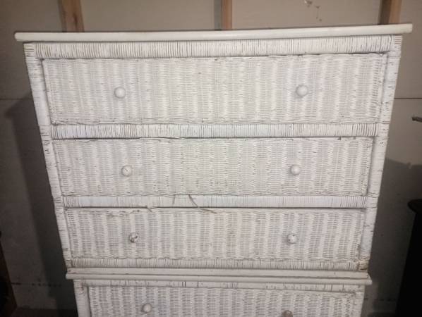 Set of 2, white wicker 3 drawer dressers, or chest of drawers. 39" length x 30" height x 19" depth.
