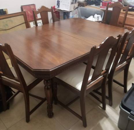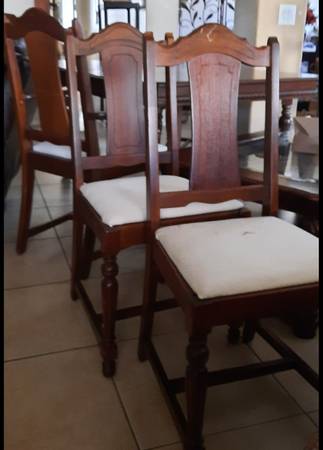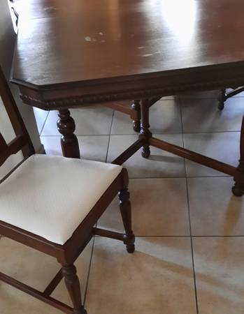 Wooden table with 2 chairs, the top has discoloration and some scratches. Chairs have some stains.