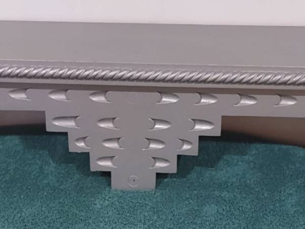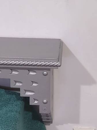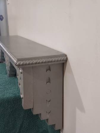 Totally southwestern to the maximum! This handmade shelf has it all... rope molding all around, covered by carved bullets and step down sides. Silver in color but can always be changed. The size is 30"long, 6" shelf, 11" in height. The middle accent is the final touch. Also have a smaller shelf listed. Cash only