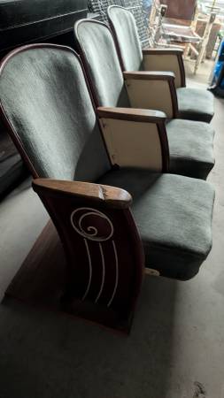Bank of three vintage upholstered theater seats in excellent condition, complete with wooden base