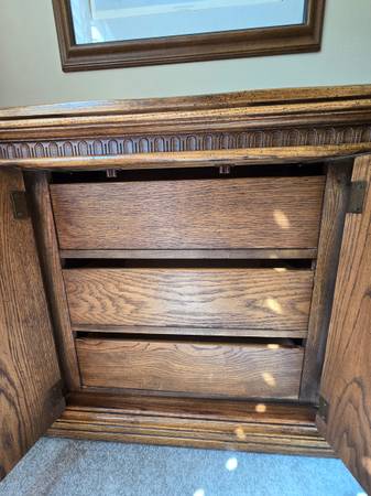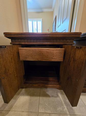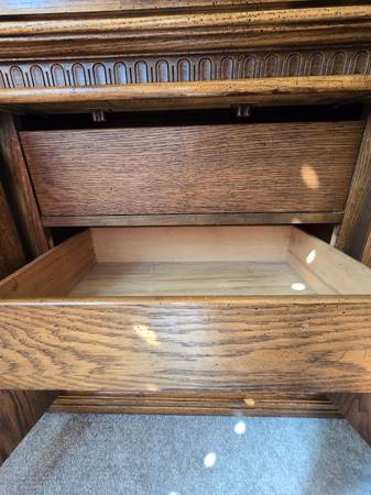 The floral pattern on the doors and headboard are very pretty. If you appreciate real wood furniture then you will love this Oak bedroom set. I have e found many times I only see one nightstand for sale and it can be difficult to find a pair.