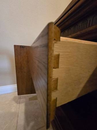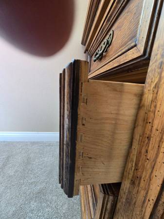 Beautiful Oak bedroom set made by Burlington House Furniture. This set is well made with solid wood and the only veneer is on the side panels. Otherwise real wood quality all the way. Check out the side view of the drawers as they are dovetail quality made. Not just glued together like basic quality furnishings.