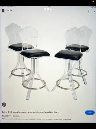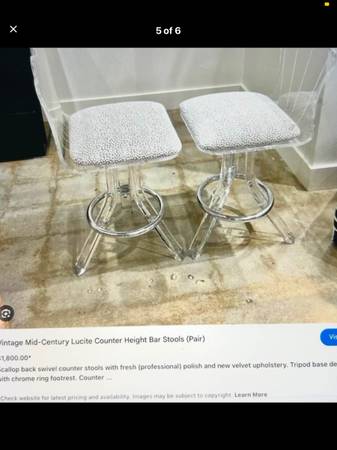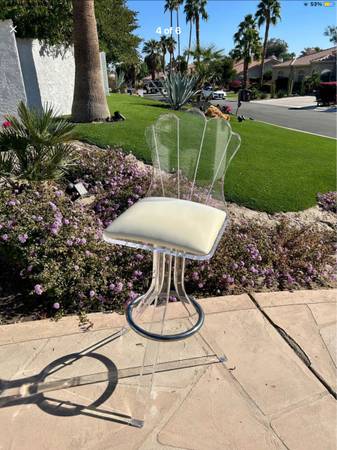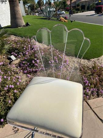 Price is for pair. GREAT condition. White leather. Scalloped lucite back. Chrome ring foot rests. Tripod. Check out what they sell for on other sites.