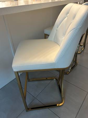 Designer Bar Stools - set of 4 White Leather Plush Seating Gold Metal Base High Quality Purchased a few months ago and selling for a fraction of the price as we are moving and cannot fit these into...