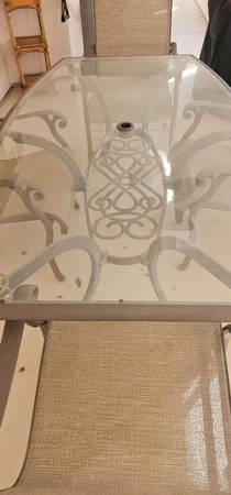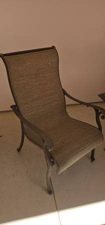 This patio set is characterized by a rectangular glass-top dining table with a tan wrought iron frame. It comes with four matching chairs, also featuring tan wrought iron frames and tan mesh sling-style seating.