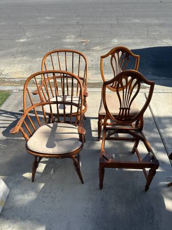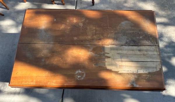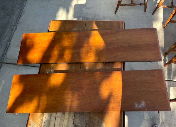 1950s/60s antique dining room table w/4 chairs, 2 leafs and toppers Top of table sustained water damage, but will look fantastic after restoration/refurbishment . 52" long (with sides locked), 72”...