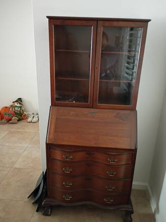 We are selling a beautiful, two-piece traditional Secretary Desk (also known as a Secretary Bookcase). This elegant, antique-style piece features both a functional writing area and valuable storage/display space. It is perfect for a home office, library, or formal room.