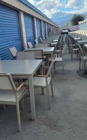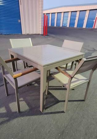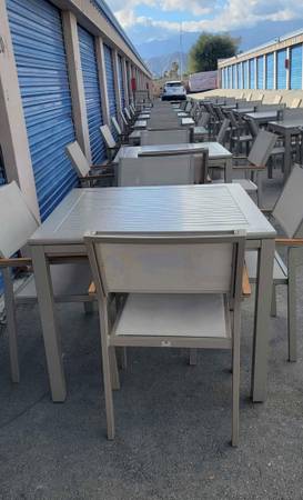 Commercial grade patio set is in excellent condition, heavy duty chairs for heavy capacity, nice teak on the chairs arms, they are super comfortable, no need cushions design , nice for hotel, resorts, restaurants, or any residential area, the price is $599 for a set, one set includes one 36" x 36" table and four chairs, the brand of the set is Gloster. Delivery available for fee. Pick up Address: 74876 42nd Ave, Palm Desert 92260