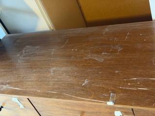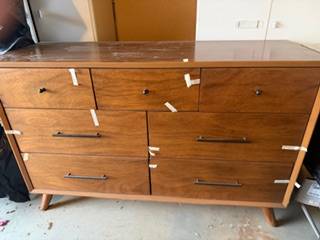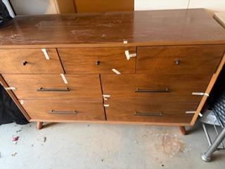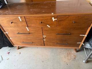 Mid century modern walnut dresser. Strong and sturdy. All drawers and handles are smooth. Yes the top has some scratches and wear, but overall great dresser, everything works and amazing walnut...