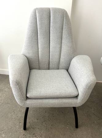 This pair of Adrian Pearsall-inspired upholstered chairs were purchased at Interior Illusions. They were for a remodel of our front room but are just a bit too big proportionately. They were $1450 each. They are an amazing deal at $750/pair, but with the holidays coming we do not have room to keep them. They are very comfortable and have a very light gray woven upholstery with black metal legs.