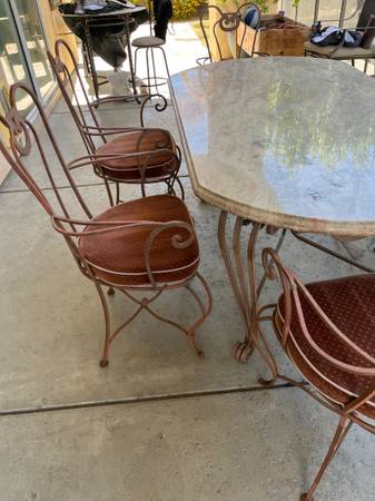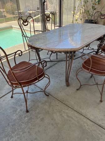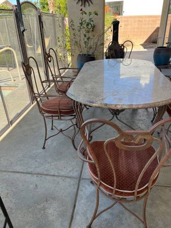 Beautiful wrought iron table beautifully made with nice granite table top. Six armrest chairs with custom made seat bottoms for sale. Bring help. Very heavy