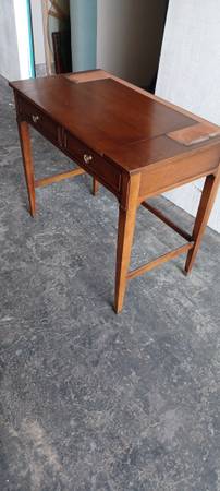 Timeless clean lines and solid quality design by Drexel, Triune collection. This vintage mid century desk with hutch has been well cared for and is in like new condition. The attached hutch has 1 permanent shelf in the center, and 1 adjustable shelf inside each of the doors. There are 4 small drawers at the base of the hutch. A slide out desk top creates additional workspace. There are 2 large drawers in the base of the desk. The brass wire door fronts, brass capped feet, original hardware, and vintage patina give this piece its charm and character.
