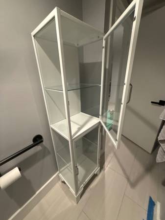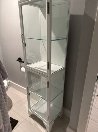 Bathroom floor standing cabinet made from glass and metal. In like new condition. $100 13” d x 17” wide x 62” high. Easy to move the doors come off easily.