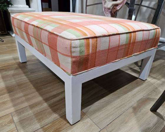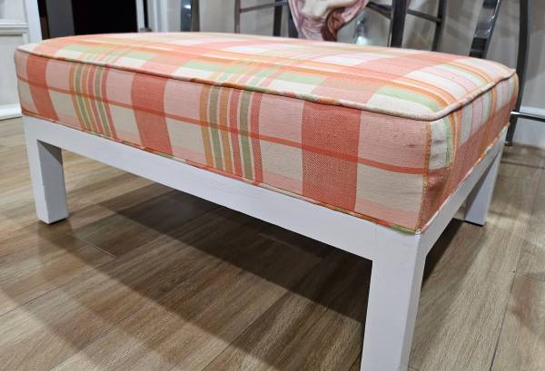 Ottoman with Pink Peach White Green Cream Coral Coloration and White Wood Base!