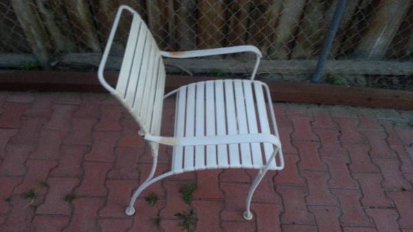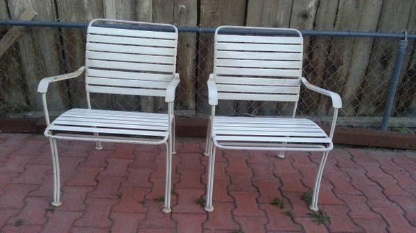 Very well made mid-century, heavy wrought-iron frame with vinyl straps matching pair of Patio Chairs. They look like and maybe vintage Russell Woodard patio chairs. Please call Marc