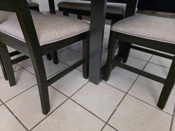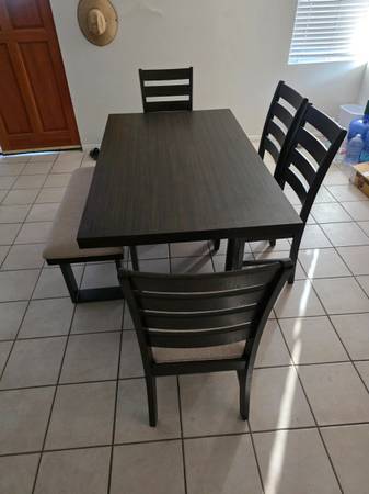Dinning Table 6 Piece Set, 4 Side Chairs and Bench Brand: Sullivan - Picket House Furnishings Lightly used 3'-2" wide x 5'-4" long (38" x 64") Text
