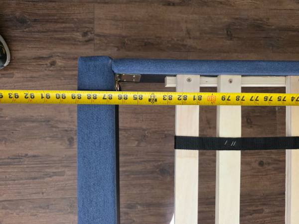 King Size - BED FRAME & HEAD BOARD ONLY - BLUE CLOTH See pictures Pick up in Yucca Valley, CA Text