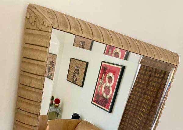 Phyllis Morris Mirror Solid hand carved wood frame 32” wide 45” high 5” deep Beveled glass mirror Heavy $80