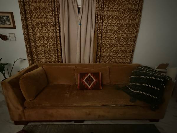 Beautiful golden vintage extra large sofa can be separated into two pieces or placed in a L shape in perfect and excellent condition comes with extra pillows Heavy, so it must be picked up