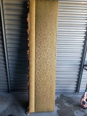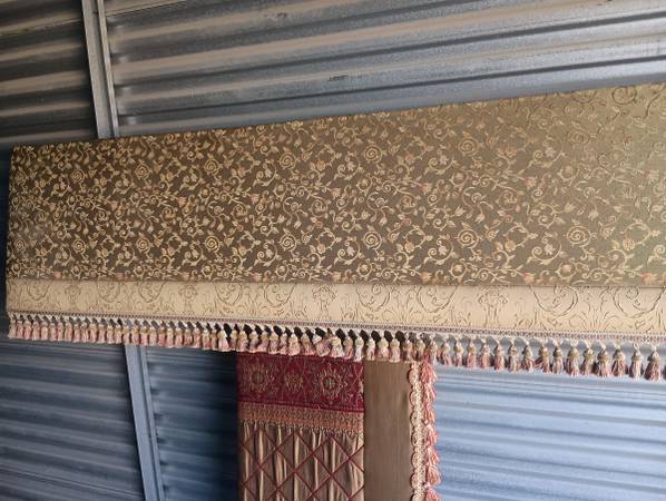 Custom-made, fabric design valance, 72" length x 18" height. Green and gold colored, custom-made design pattern, 1" x 4" pinewood. Window Valance