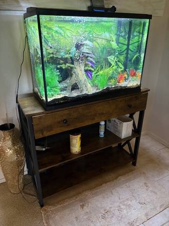 Beautiful complete aquarium set up, including stand. All plants, water filter, air pump and much more. All you'll need are the fish. Great discount value. Tank is 30" wide x 20" high x 12" deep. Approx 30 gallon. Table is 39-1/2" wide x 32" high. Steel frame.