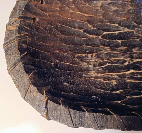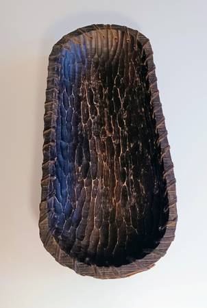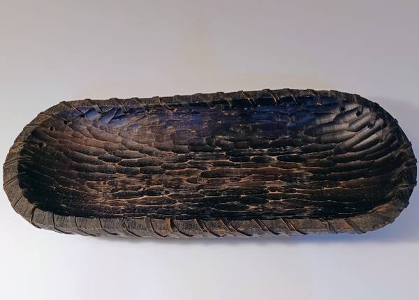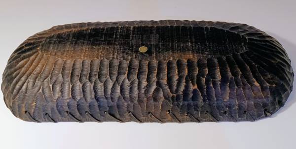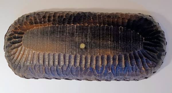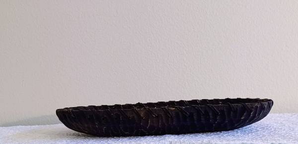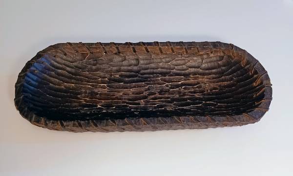 Distressed wood bowl / tray with leather whip stitching • Oval shape • Dark wood with distressed finish • Leather whip stitching on rim • Made in Philippines Size: 8" wide x 18-1/4" length If you...