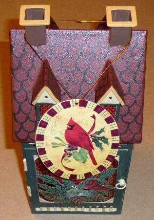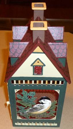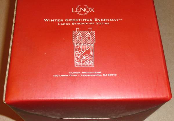 This is a brand new Lenox For The Holidays "Winter Greetings Everyday" Large Holiday Birdhouse Votive Candleholder by artist Catherine McClung, part of Lenox's Winter Greetings metal toleware collection which was discontinued in 2011. This lovely hand-painted and elaborately decorated toleware birdhouse is adorned by two raised/dimensional Cardinal birds and two Chickadee birds -- one on each side -- that are perched within a collection of colorful Christmas holly and pinecones. The front of the birdhouse has a locking hinged door which allows placement of a traditional tea light/votive candle or a more modern soot-free battery powered light (which will avoid wax drippings and maintain this collectible's pristine condition). Dimensions are 5" Wide x 5.25" Deep x 10" High, with an all-metal weight of 2 pounds. Included is the original retail box and descriptive Lenox hang tag with its $72.00 suggested retail price sticker. Lenox also sold these holiday-themed birdhouses in a smaller 7" version, but this is the harder to find larger 10" model which usually sells online for $55.00. All photos were taken by me in my smoke-free home and honestly represent the brand new condition of this beautiful limited edition Lenox holiday birdhouse candleholder.