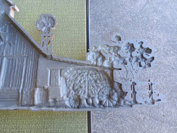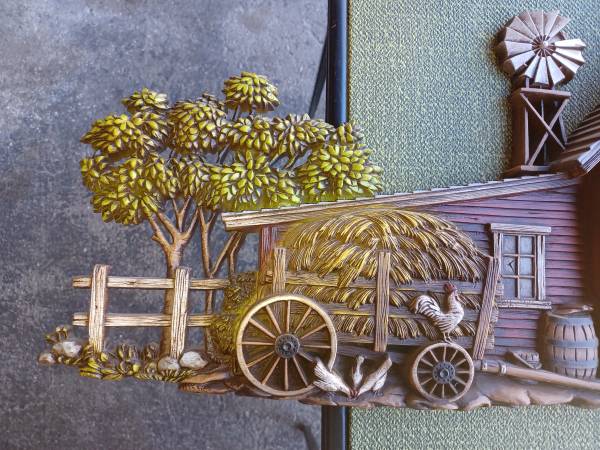 Burwood Products Farm Or Barn Scene #587 1974 $150obo Here WE HAVE: A vintage Burwood Products Co. wall hanging! Marked on the back as model 587 and roman numerals for the year 1974. This is a large 3d farm scene! Features a barn, silo, windmill, hay-filled wagon, an old car up on blocks and various farm tools scattered about. Nice for a farmhouse wall!