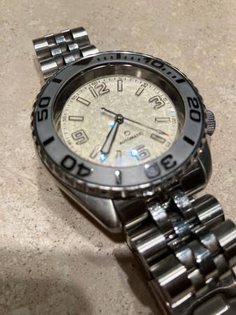 THIS IS A SEIKO WITH NO NAME ON FACE. THE BEZEL IS STYLED AFTER THE FAMOUS YACHTSMAN. THE ENGINE IS AN NH-35 BY SEIKO. IT WAS MODIFIED FOR ME IN OREGON AND HAS HARDLY BEEN WORN. IT IS A PERFECT DIVE WATCH THAT HAS NEVER BEEN IN WATER DIAL IS 3,6, 9 STYLE BRUGUET NUMERALS ON A METEOR OFF WHITE FACE WITH TEXTURE. IT IS A ONE-OF-0A KIND WATCH THAT TURNS HEADS SINCE IT IS S DESIGNER ONE OFF STYLE. UNIQUE. KEEPS PERFECT TIME. VERY MASCULINE JUBILEE STYLE BAND. EXTRA LINKS.