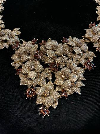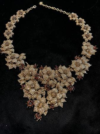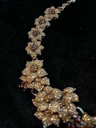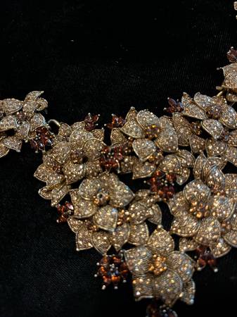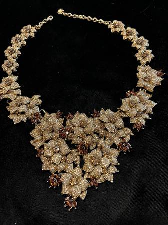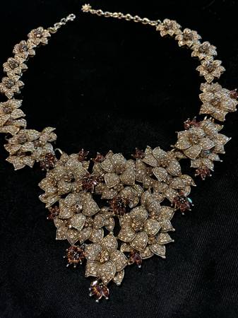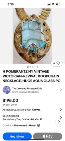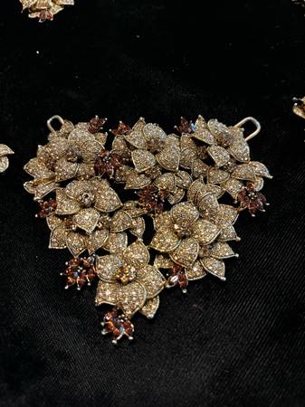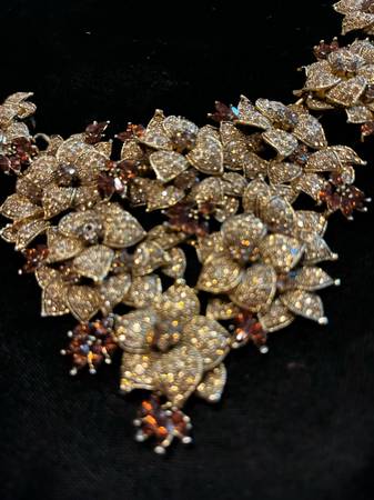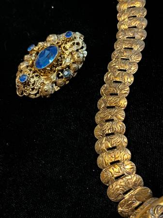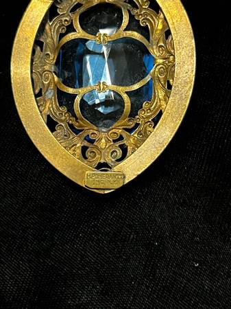 H. Pomerantz huge deep blue cut glass jewel on revival book chain necklace and two fur clips .