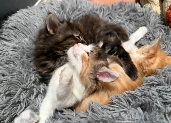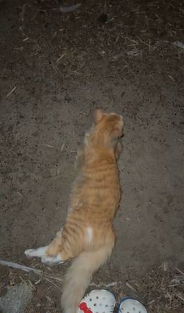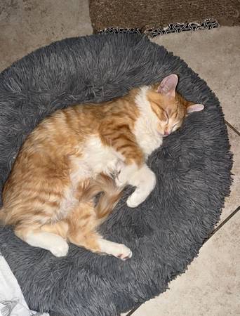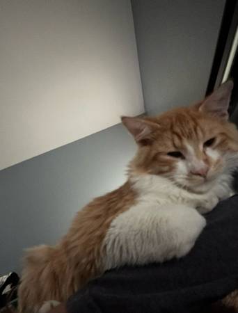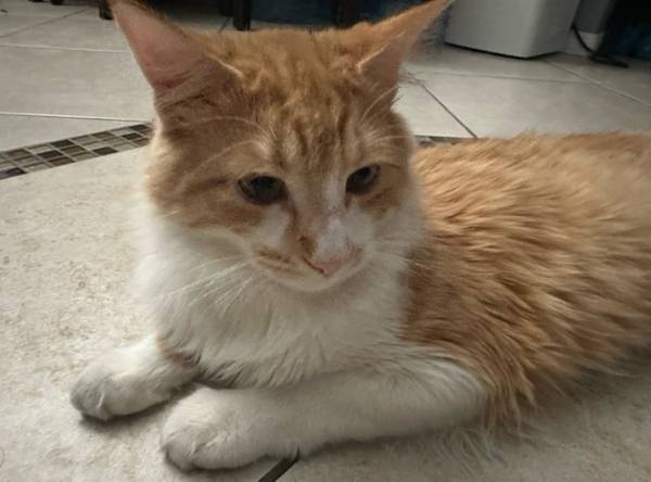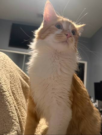Some of his distinctive features are the little white patch on his left side and his one full white sleeve the rest of his legs are orange except for the bottom half He is also very fluffy with a fluffy tail.