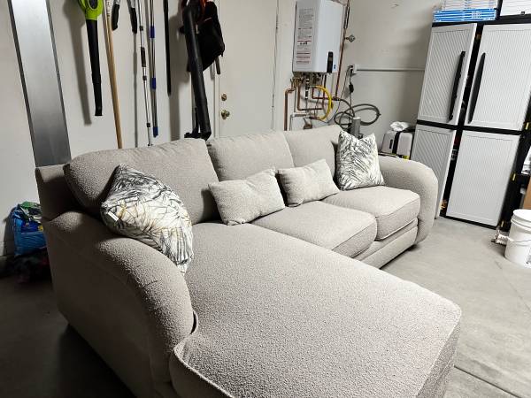 Very well-made Bernhart sofa recovered less than a year ago in a bouclé fabric. In excellent condition, no stains or rips size is 94 incheswide 40 inches deep and the chaise lounge is 67 inches deep.