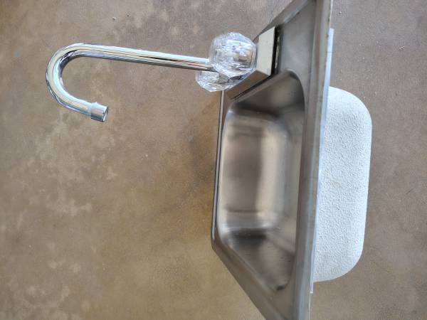Stainless steel sink with gooseneck faucet - 15" square, bowl is 12" x 10" x 5" deep - Includes gooseneck faucet and water supply lines $40 complete - Contact phone number is necessary for a return...