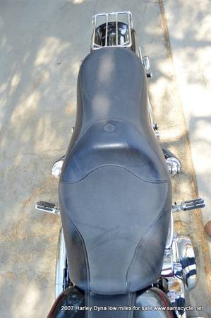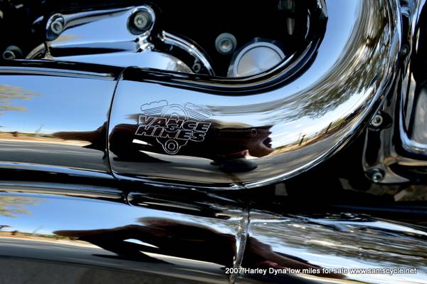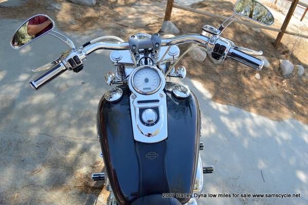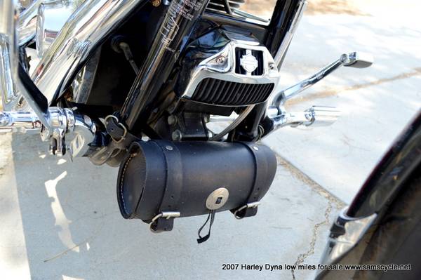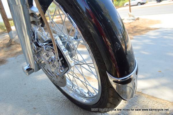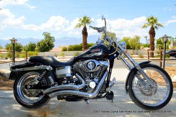 The 2007 Harley-Davidson Dyna Wide Glide (FXDWG) is a factory custom cruiser featuring a 96 cubic inch (1584cc) engine, a six-speed transmission, and signature styling with a raked-out 49mm front fork, a 21-inch front wheel, and ape-hanger handlebars. It also includes a bobtail rear fender, a tank-mounted speedometer, and it comes with the optional Profile Laced Wheels.