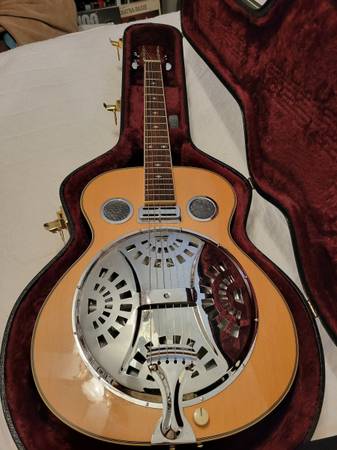 King resonator steel guitar. Has been electrified with vintage D Armond pickup. Round neck but set up with vintage nutt riser. Comes with new Gretsch hard shell case. Call Frank