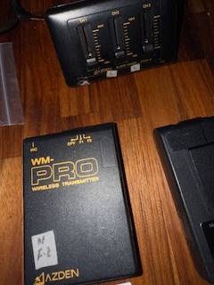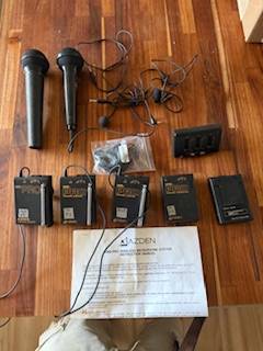 AZDEN SOUND SYSTEM, 2 transmitters, 3 receivers, 2 lavaliers, 1 wireless mike, 1 corded mike, 1 input mixer, all in good working condition,